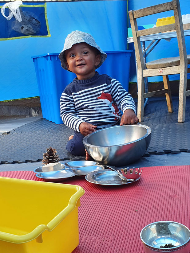 The fourth part is the best! The top half of the garden is fenced off just for the children's play area. It has artificial grass so when the weather is not great the kids can still play without getting muddy or too wet. During the summer we put gazbos up to provide shade and we also have our own outside learning area (a large well ventilated tent) so we can carry on our learning outside whatever the weather.